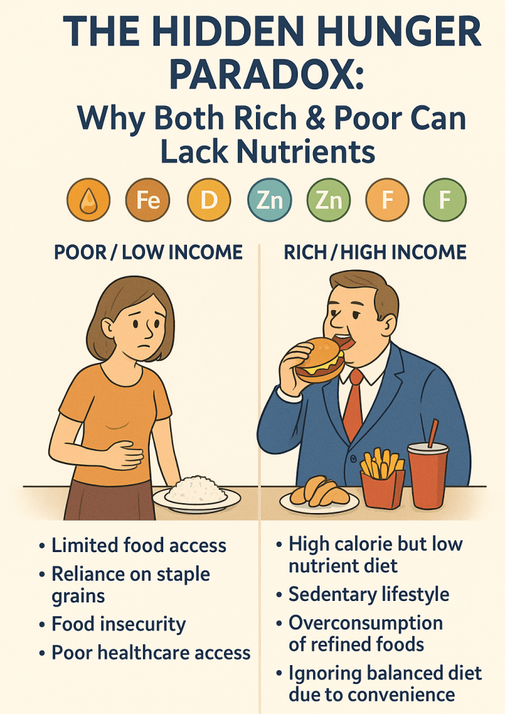 • Rich: Overconsumption of processed foods → calorie excess, micronutrient scarcity.